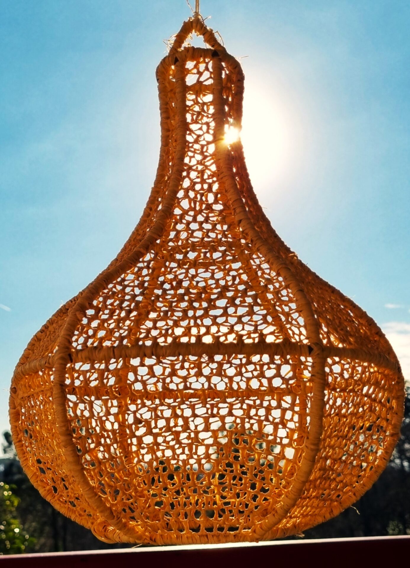 Un magnifique abat-jour à la forme originale. Tressé à la main en raphia naturel sur son armature en métal galvanisé.